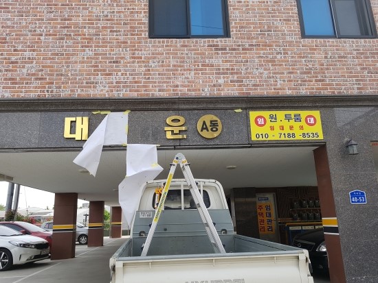 그런데 이 분이 직접 방문하신 이유는 근처 상가주택 타운하우스의 건물주로 자기 건물 주차장으로 진입하는 트럭이 철재를 실고 들어오다 현판이 부착된 석재를 들이 받아 석재 두장이 깨지고 스카시